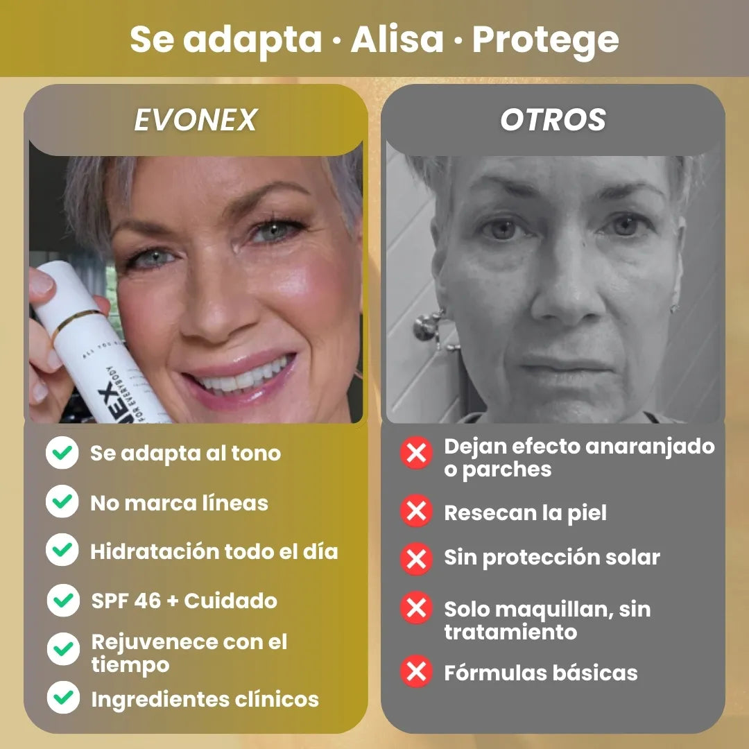 La mayoría de las bases solo tapan y resecan la piel. Evonex® es diferente: ofrece cobertura uniforme mientras hidrata, protege y suaviza líneas de expresión con cada uso.